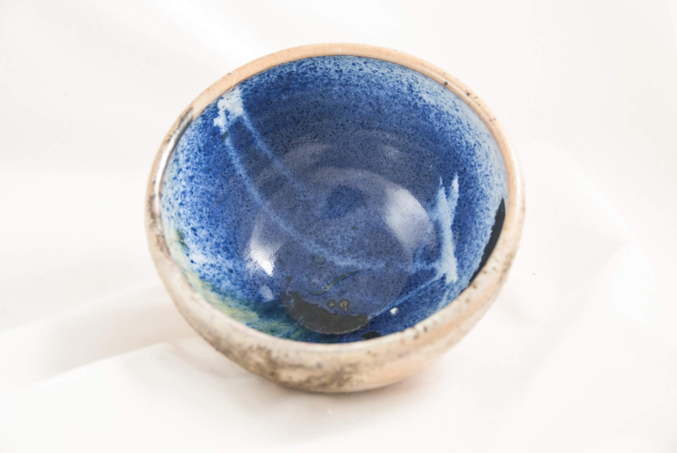 Porcelain bowl with a cobalt interior and shino and beach sand exterior.