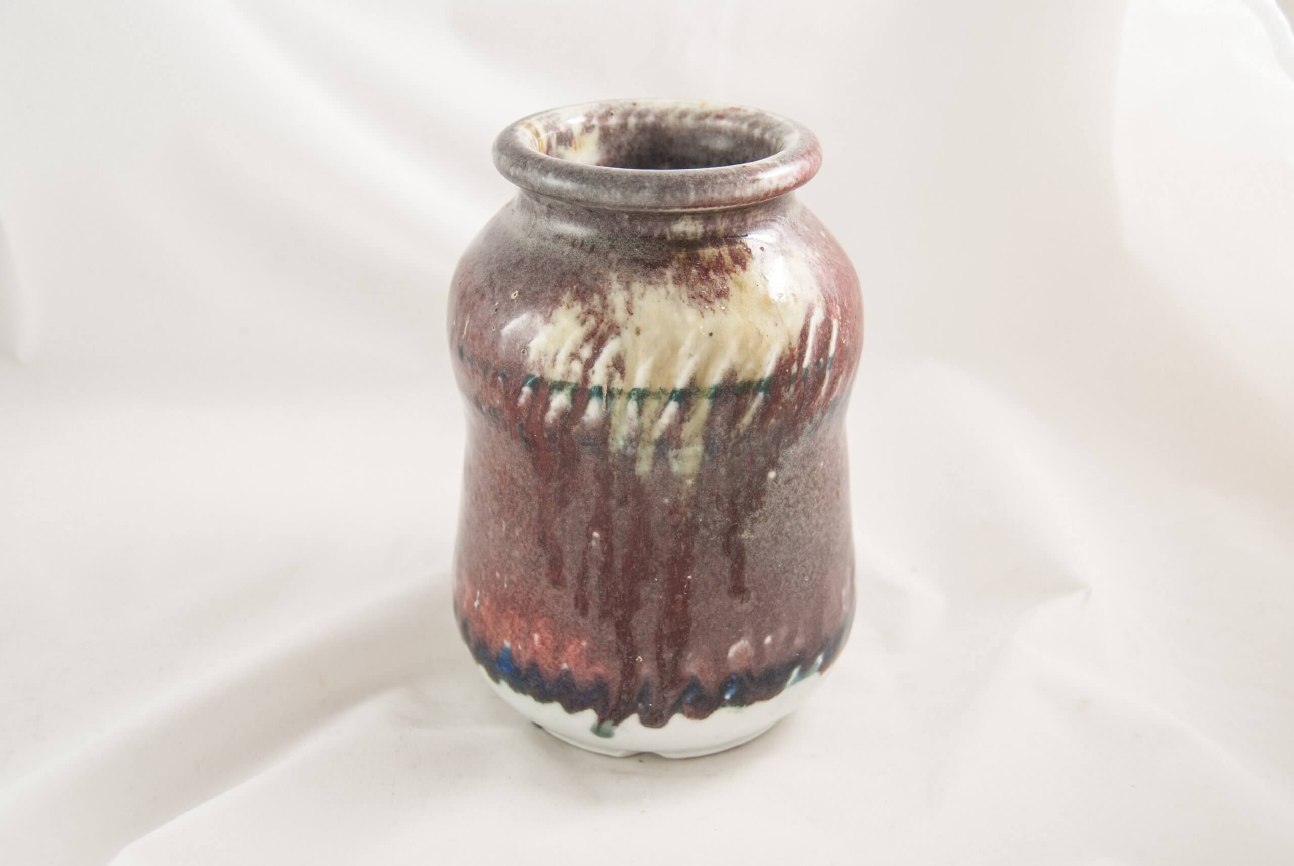 This porcelain vase measures 7 inches tall by 4.5 inches wide. It is glazed with a copper and ash glaze in varying shades of reds and browns along with cobalt accents.