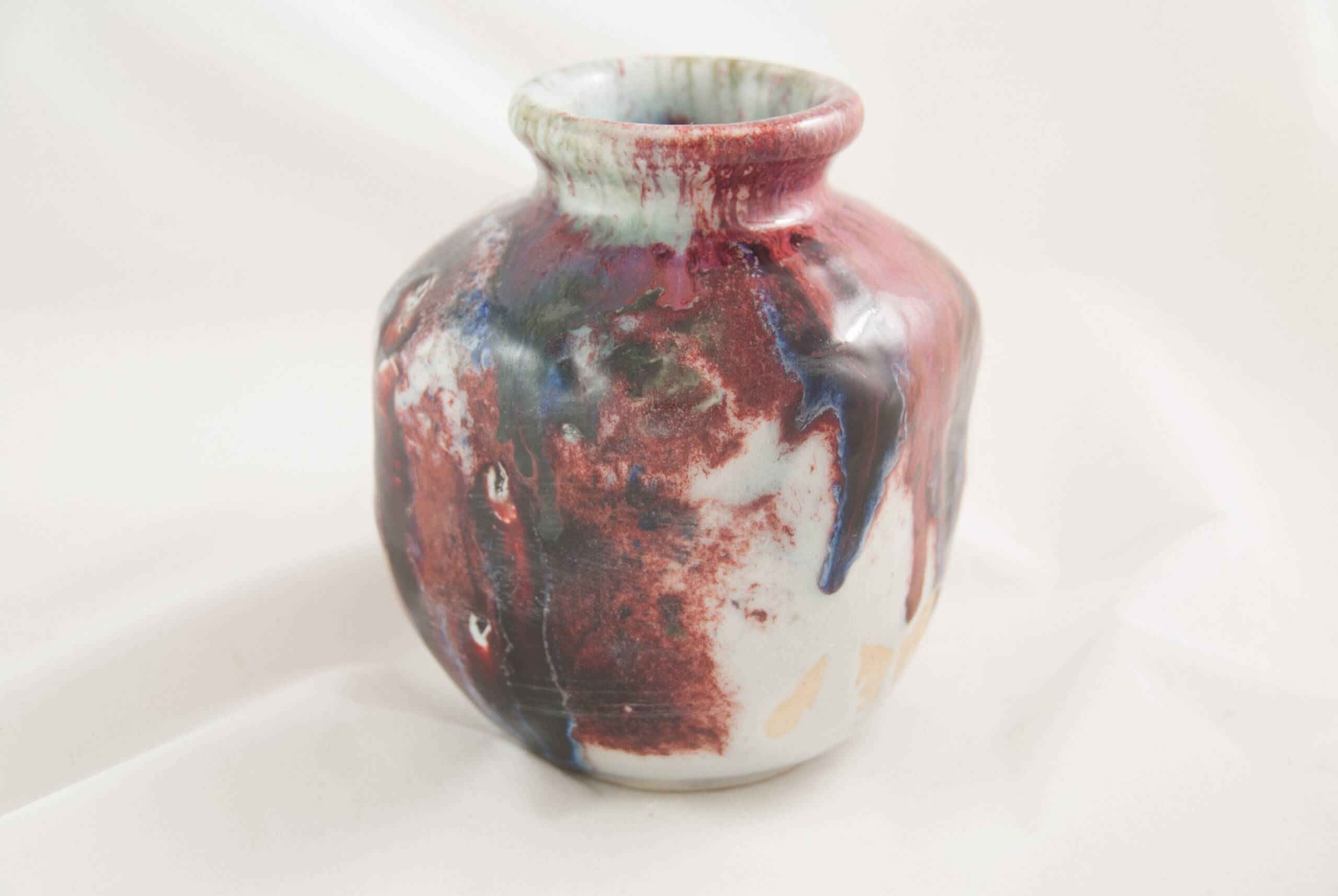 This square-sided porcelain vase measures 6 inches tall and 4.5 inches wide. The glaze is a copper red and iron with hints of cobalt that render in varying shades of red, black, green and blue.