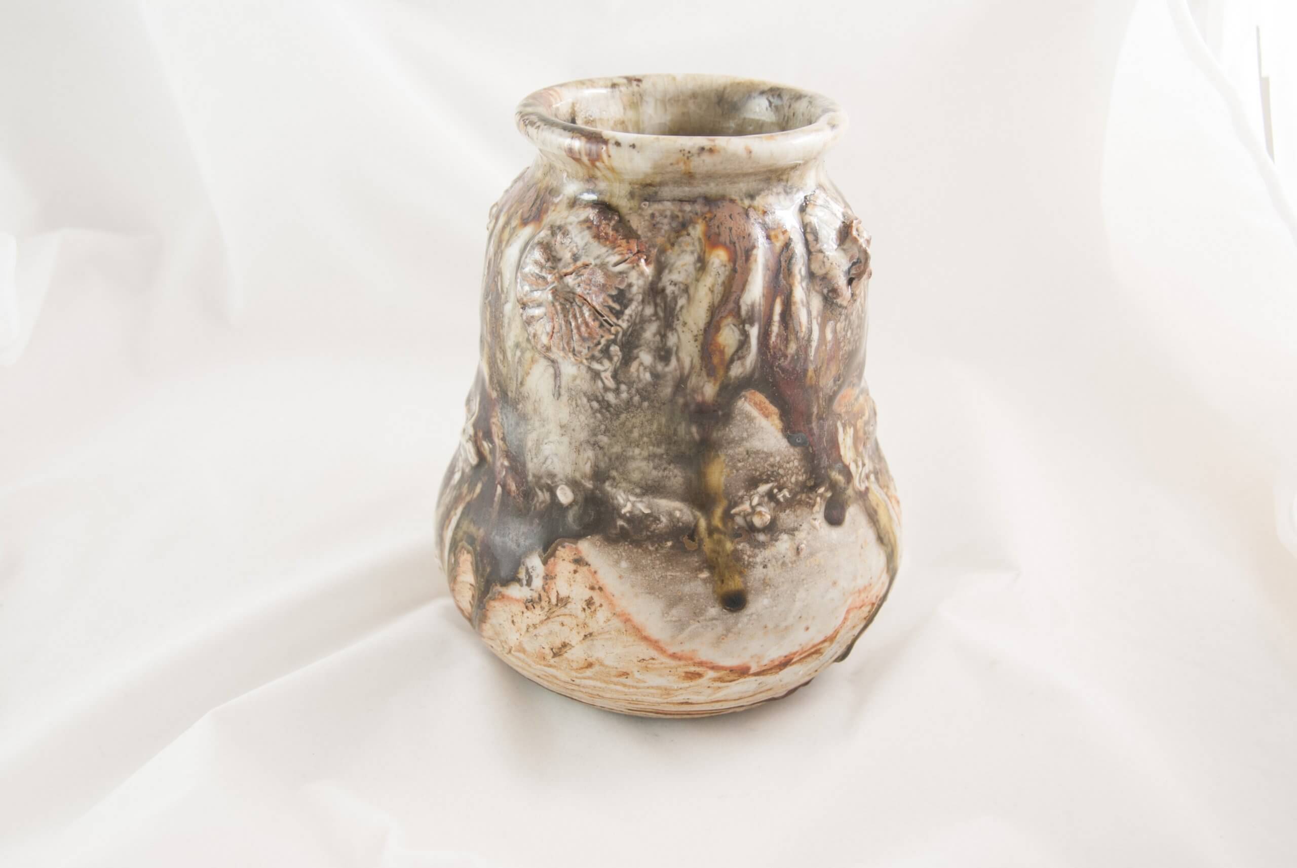 This porcelain vase features both shino and chun glazes with hand-tooled barnacles.