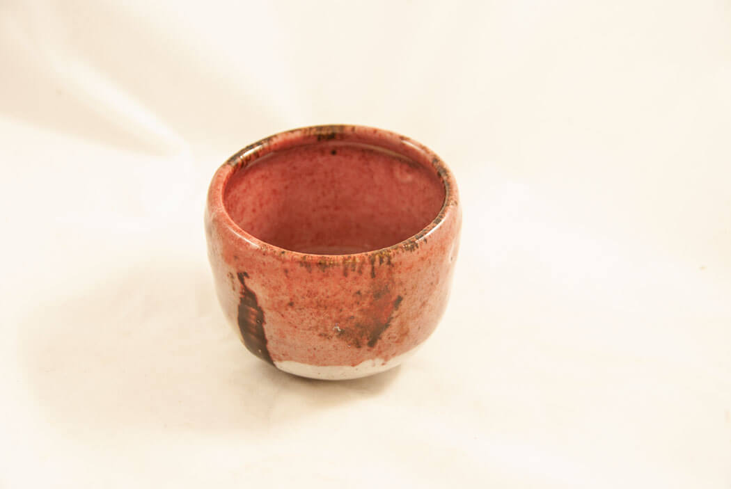 This tea bowl is made of porcelain and has a cherry blossom red shino glaze