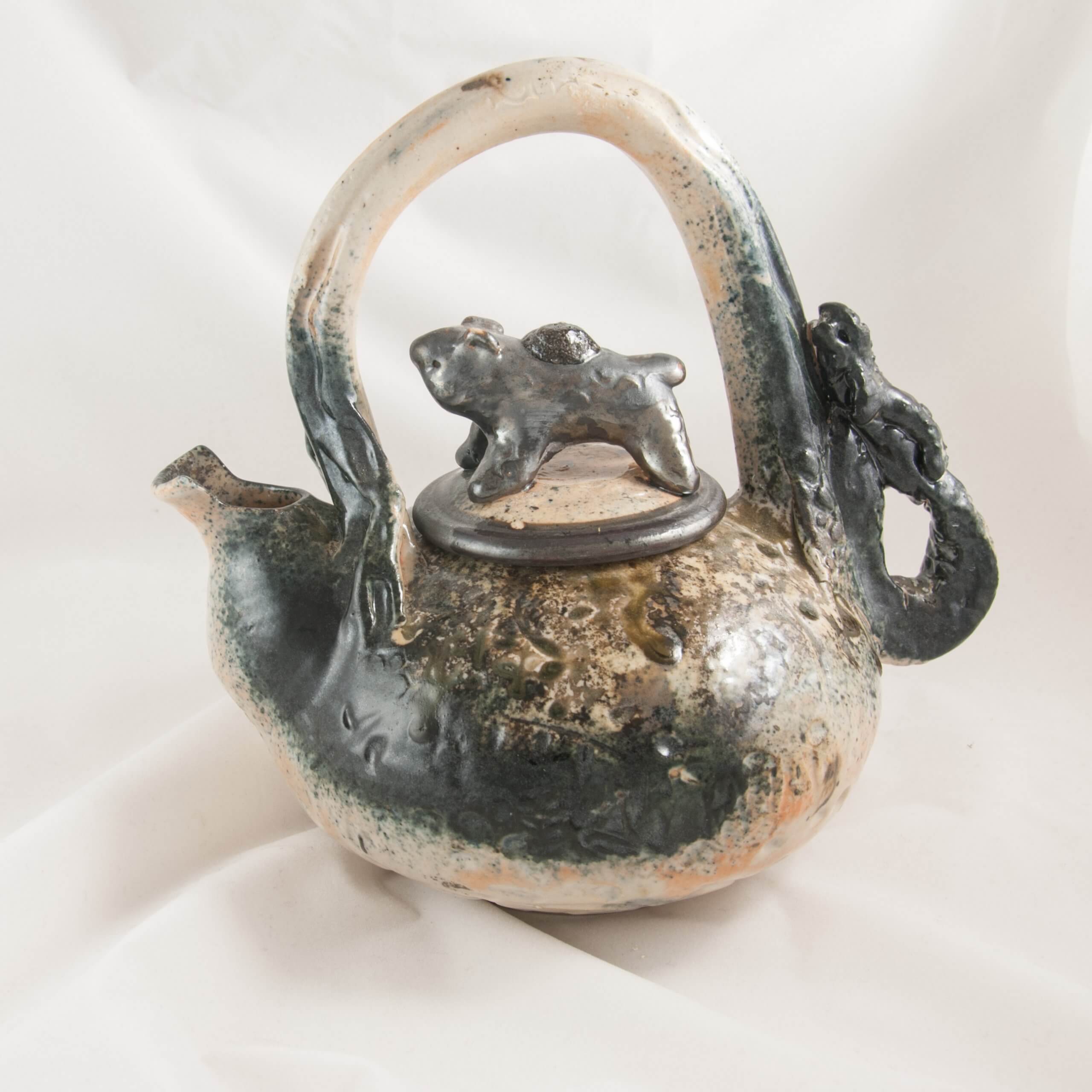 Porcelain tea pot with fixed handle and dog-ornament lid.