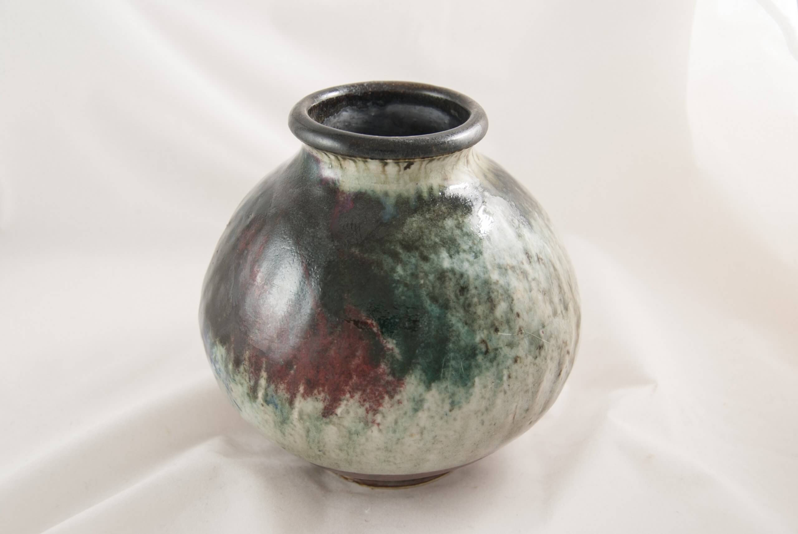 Porcelain vase measures 7 inches tall by 6.25 inches wide and has a beach sand and ash glaze.