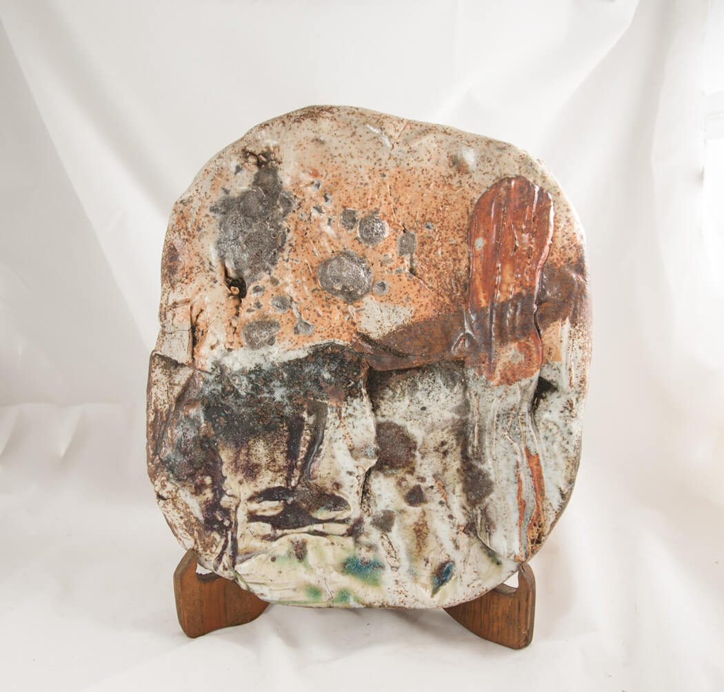 This plaque measures 12 inches wide by 10 inches tall. It is made from porcelain and features shino with mixed glazes, obsidian and ash.
